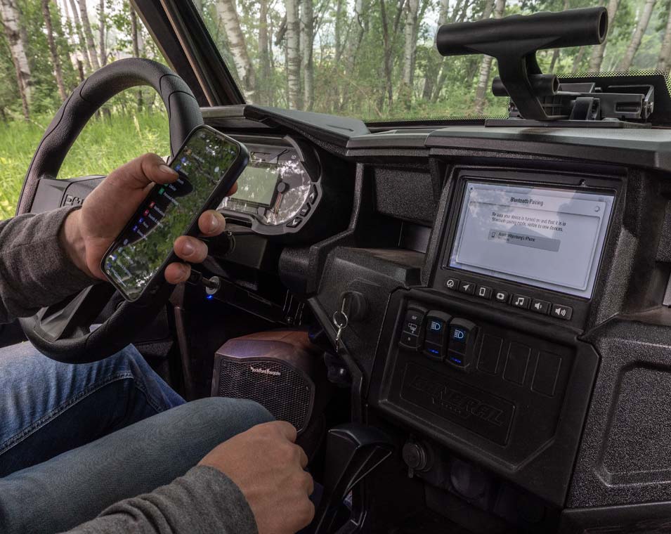 - Velocimentro e tacômetro analogicos c/ centro de informações LCD de 4" na cor azul e/ou vermelho selecionáveis pelo usuário, regulagem de brilho; intervalos de serviço programáveis; odômetro, medidor de tempo, odômetro parcial, horímetro, voltímetro, relógio, indicador de marcha, combustível, temperatura e bateria, 2 pontos de saída de energia DC. Tela 7" com Ride Command™ touch com luva: Instrumentação digital, GPS, Mapeamento, Bluetooth e USB, conectividade com celular, AM/FM, comunicação interna disponivel (via dispositivo bluetooth no capacete), Som Rockfort Fosgate (com 2 falantes coaxiais de 6.5" e 50W na dianteira e amplificador com 400W de 4 canais com regulagem de Fade, controle automatico de volume e equalizador com 5 bandas).